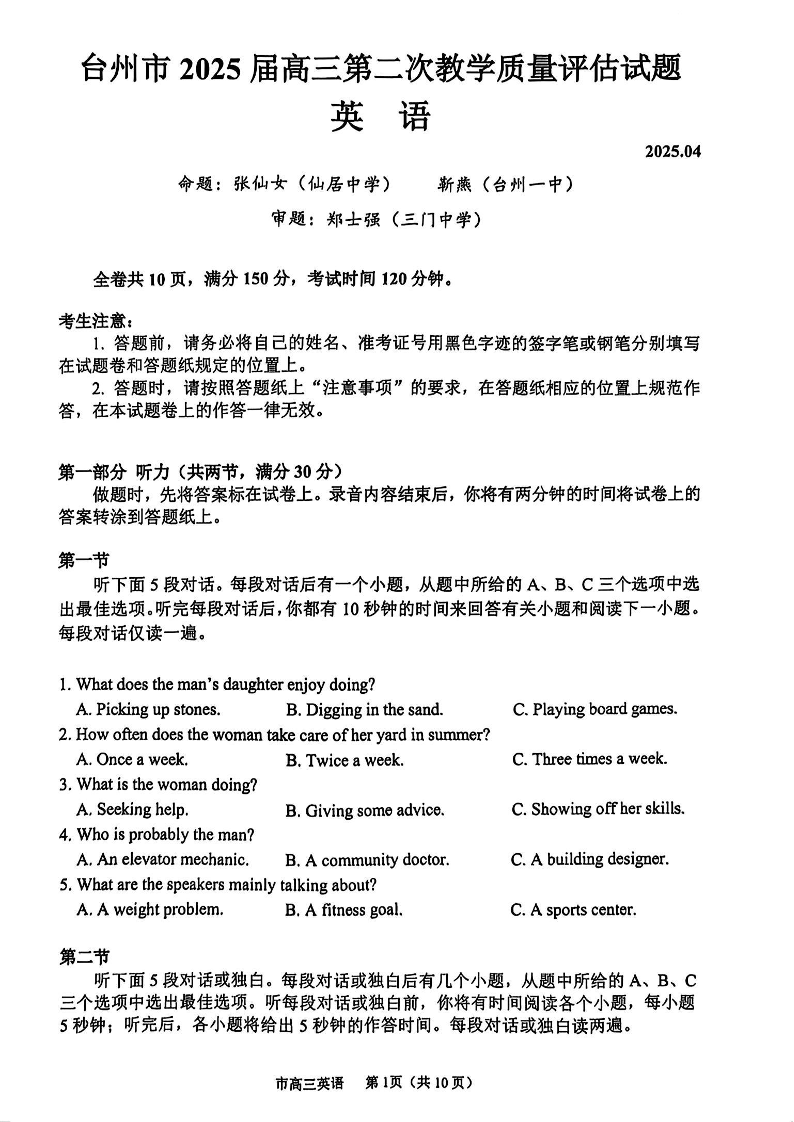 台州市2025届高三年级第二次教学质量评估试题 英语.pdf