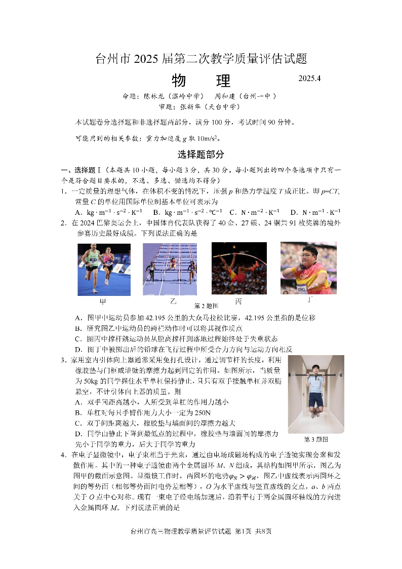 台州市2025届高三年级第二次教学质量评估试题 物理.pdf