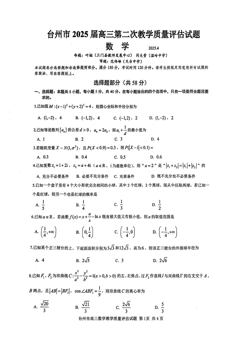 台州市2025届高三年级第二次教学质量评估试题 数学.pdf