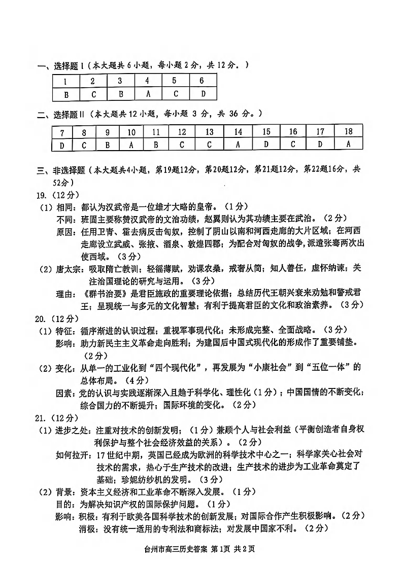台州市2025届高三年级第二次教学质量评估试题 历史答案.pdf