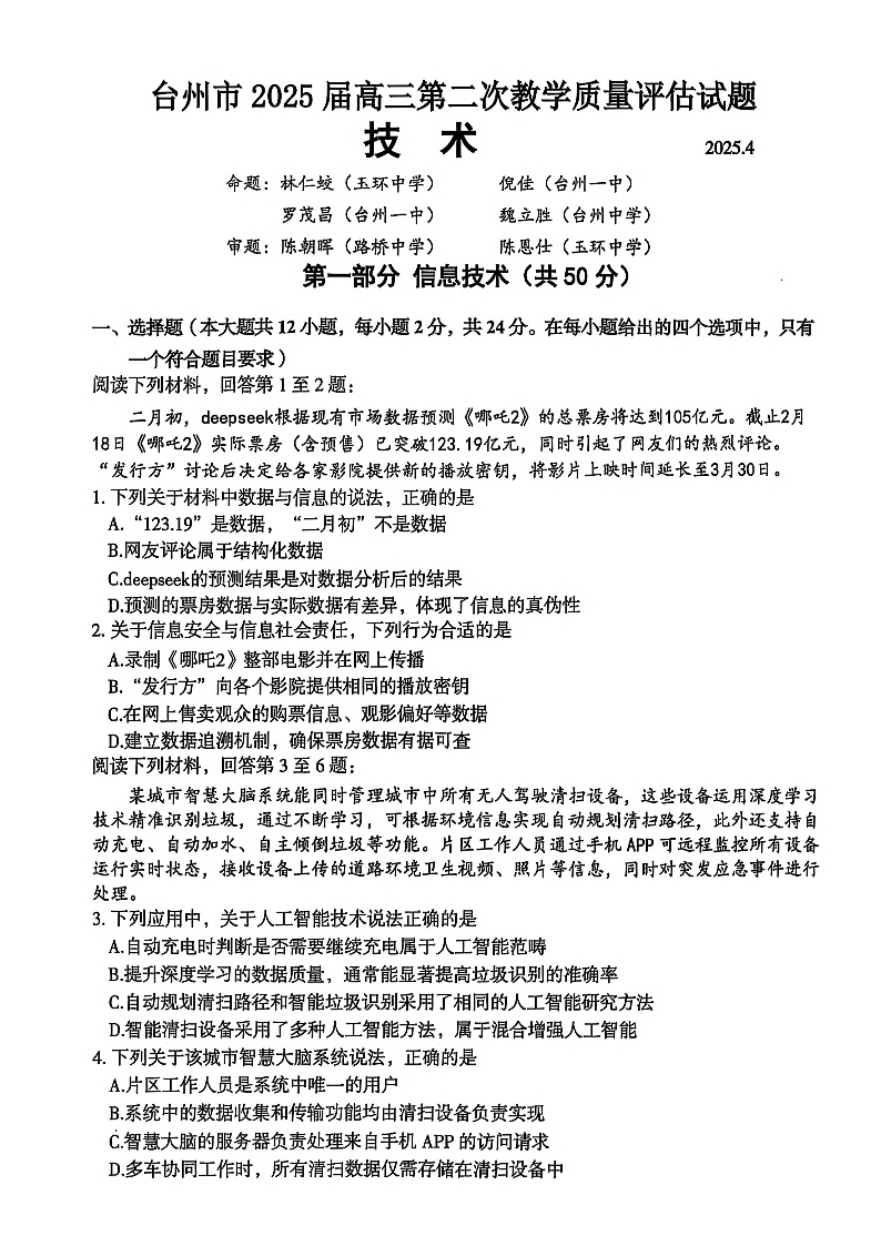 台州市2025届高三年级第二次教学质量评估试题 技术.pdf