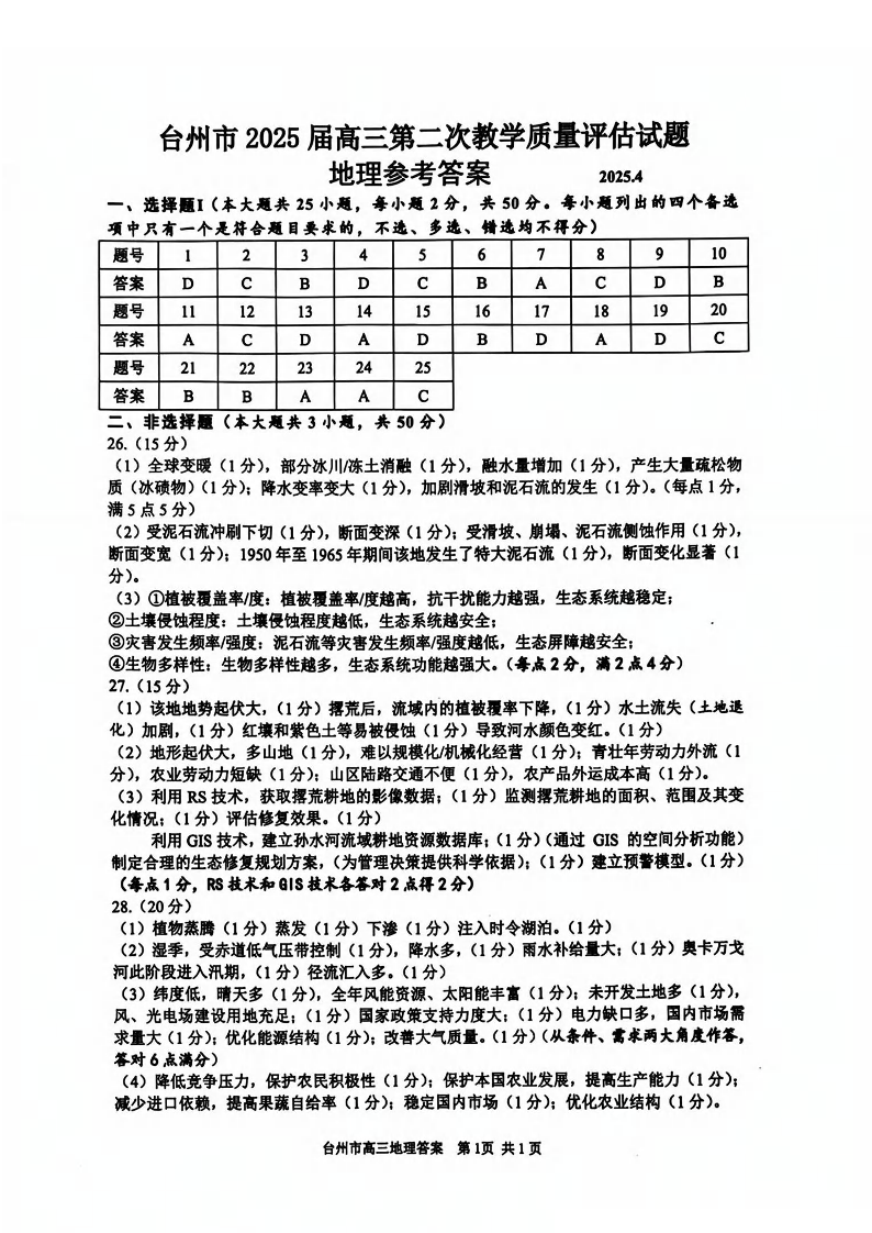 台州市2025届高三年级第二次教学质量评估试题 地理答案.pdf