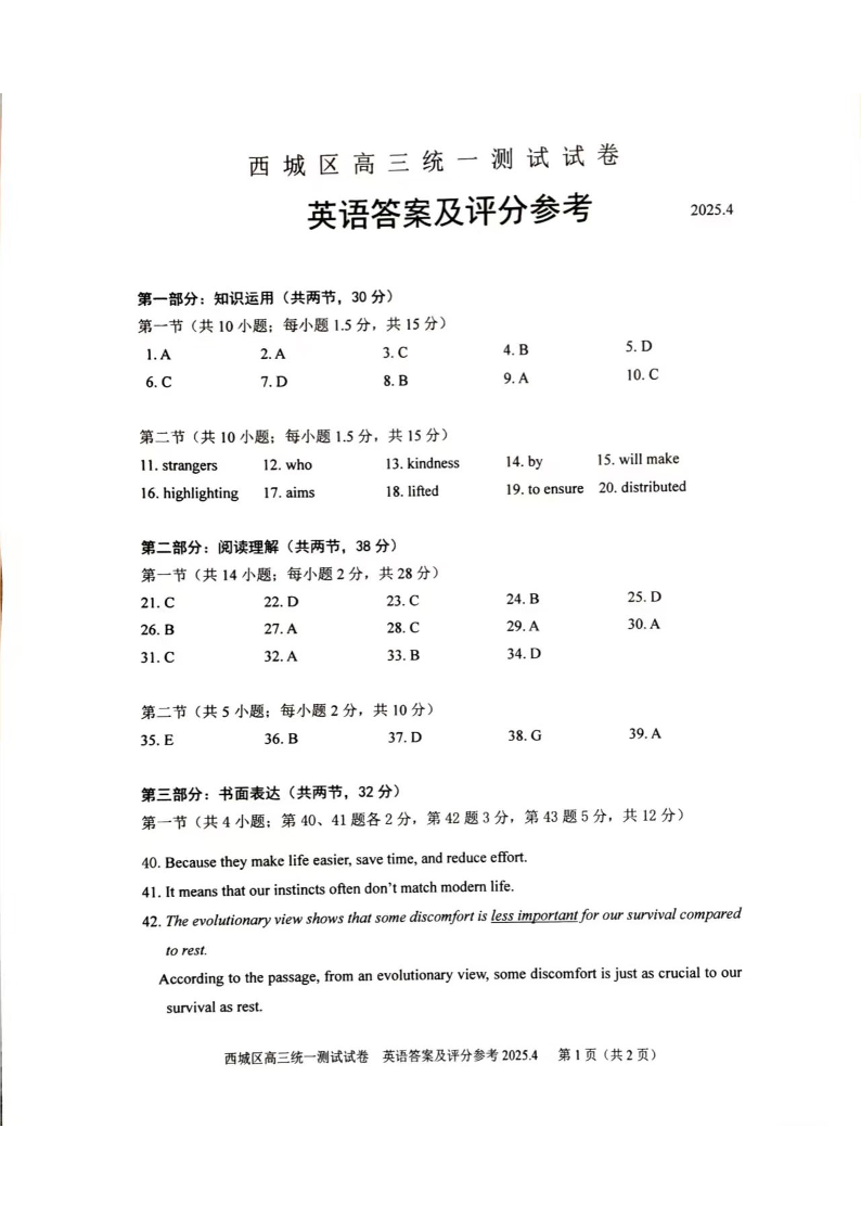 北京市2025年西城区2025届高三统一测试 英语答案.pdf