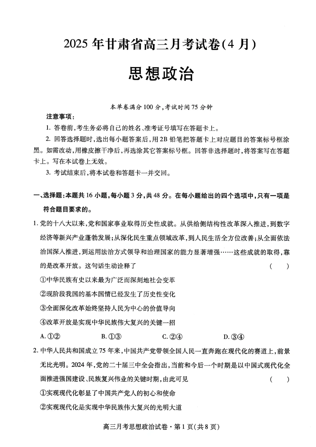 甘肃省2025年高三月考试卷(4月)政治(含答案).pdf