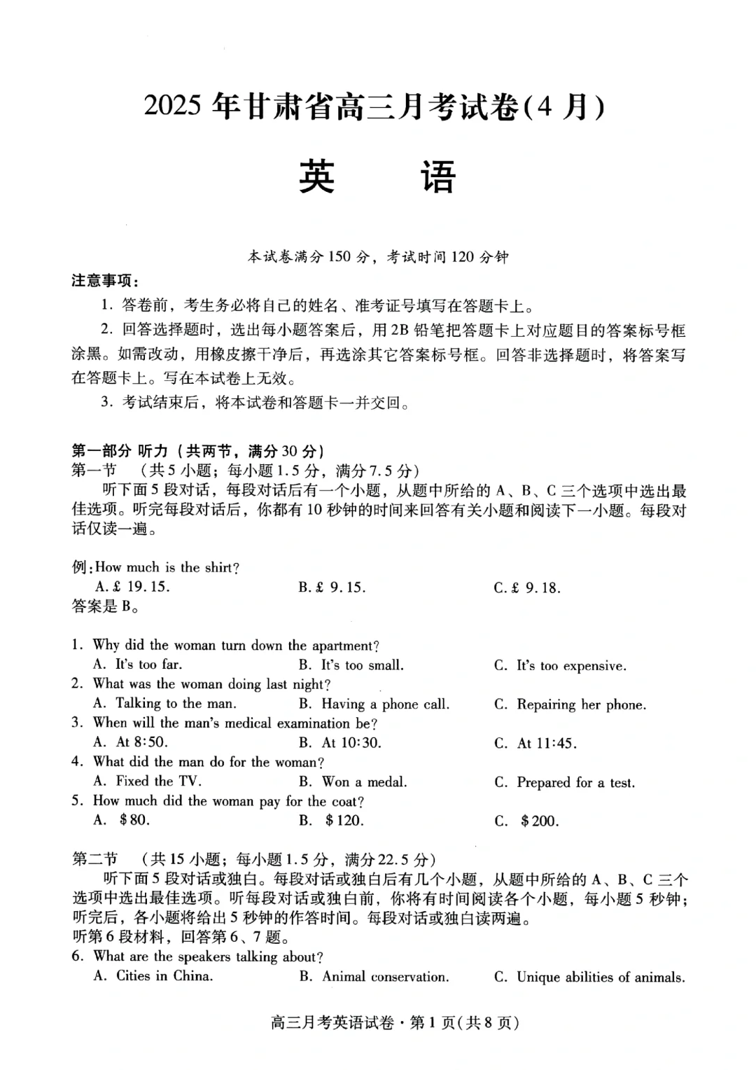 甘肃省2025年高三月考试卷(4月)英语(含答案).pdf