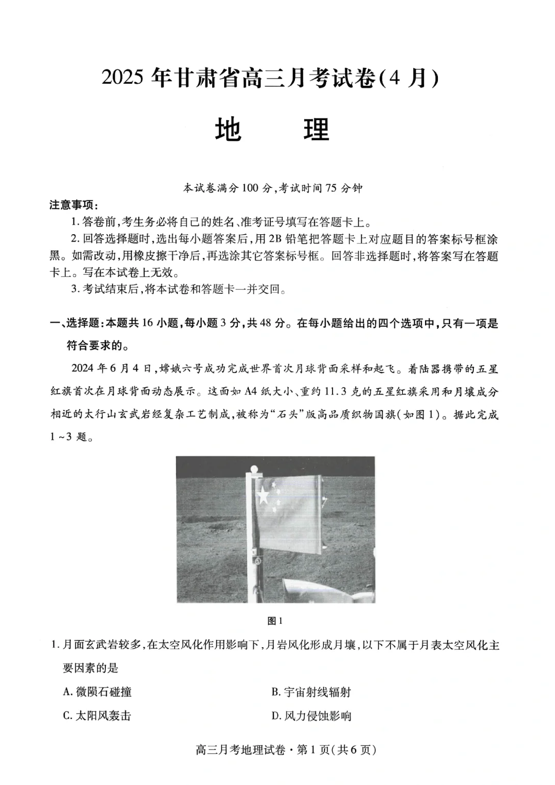 甘肃省2025年高三月考试卷(4月)地理(含答案).pdf