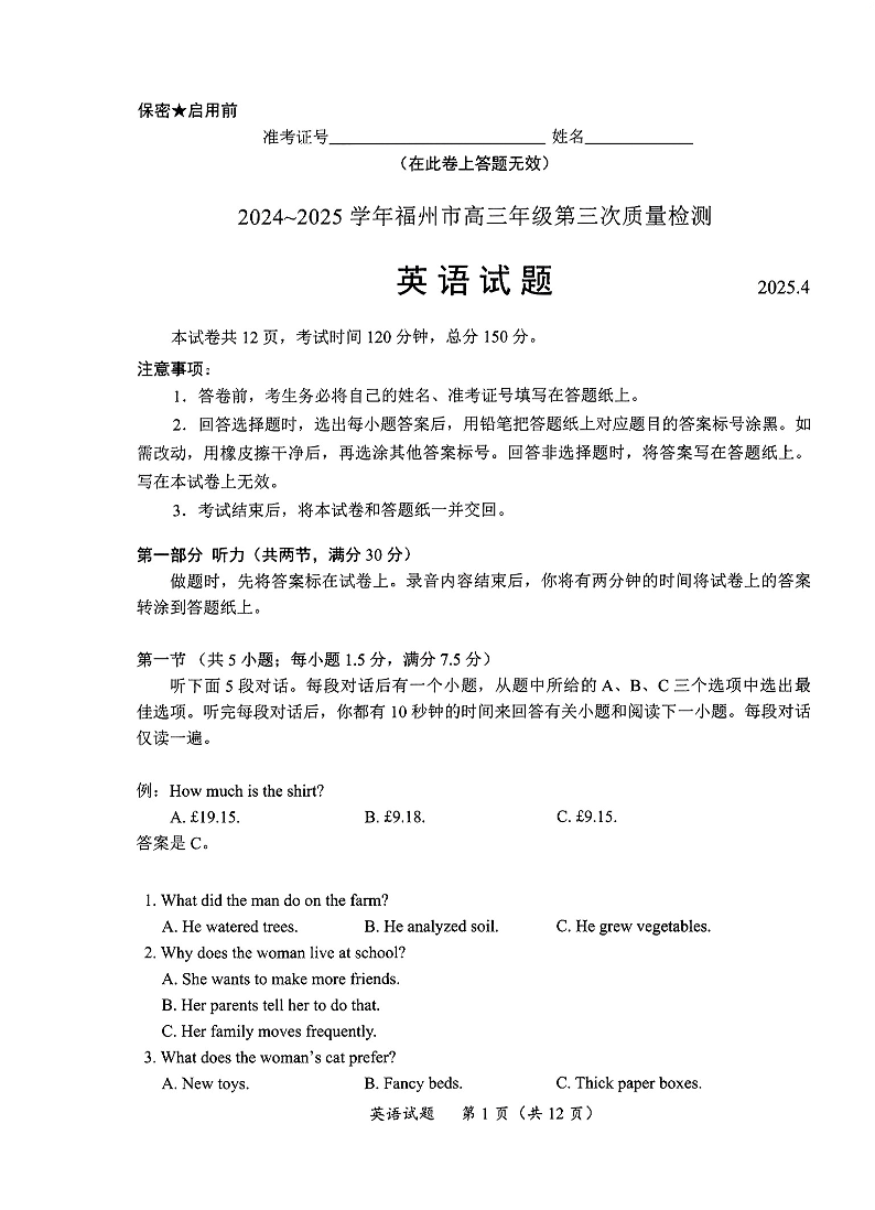 福建省九市联考2024~2025学年高三年级第三次质量检测 英语.pdf