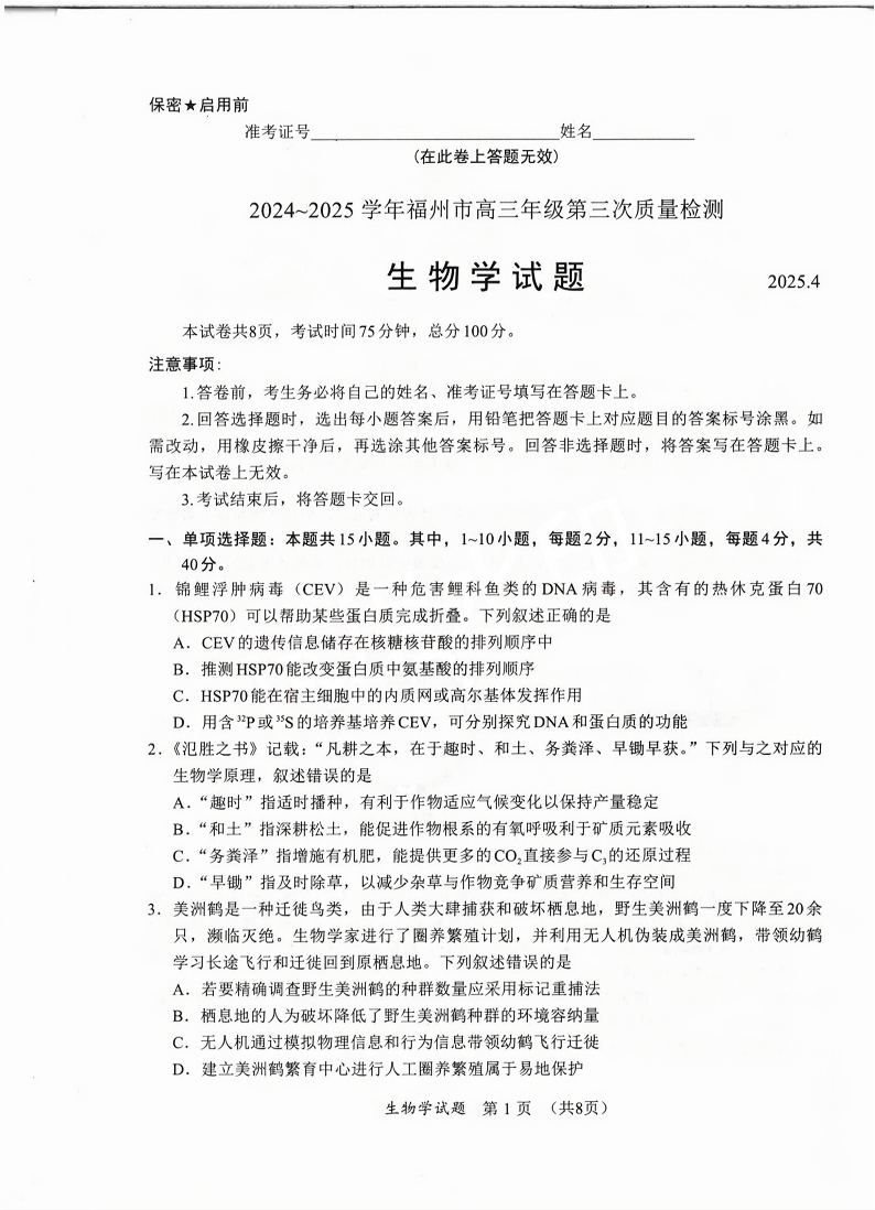 福建省九市联考2024~2025学年高三年级第三次质量检测 生物.pdf