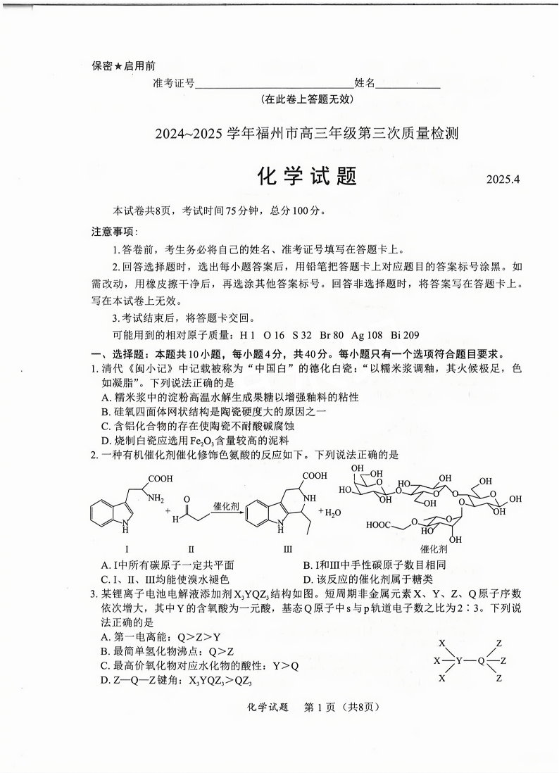 福建省九市联考2024~2025学年高三年级第三次质量检测 化学.pdf