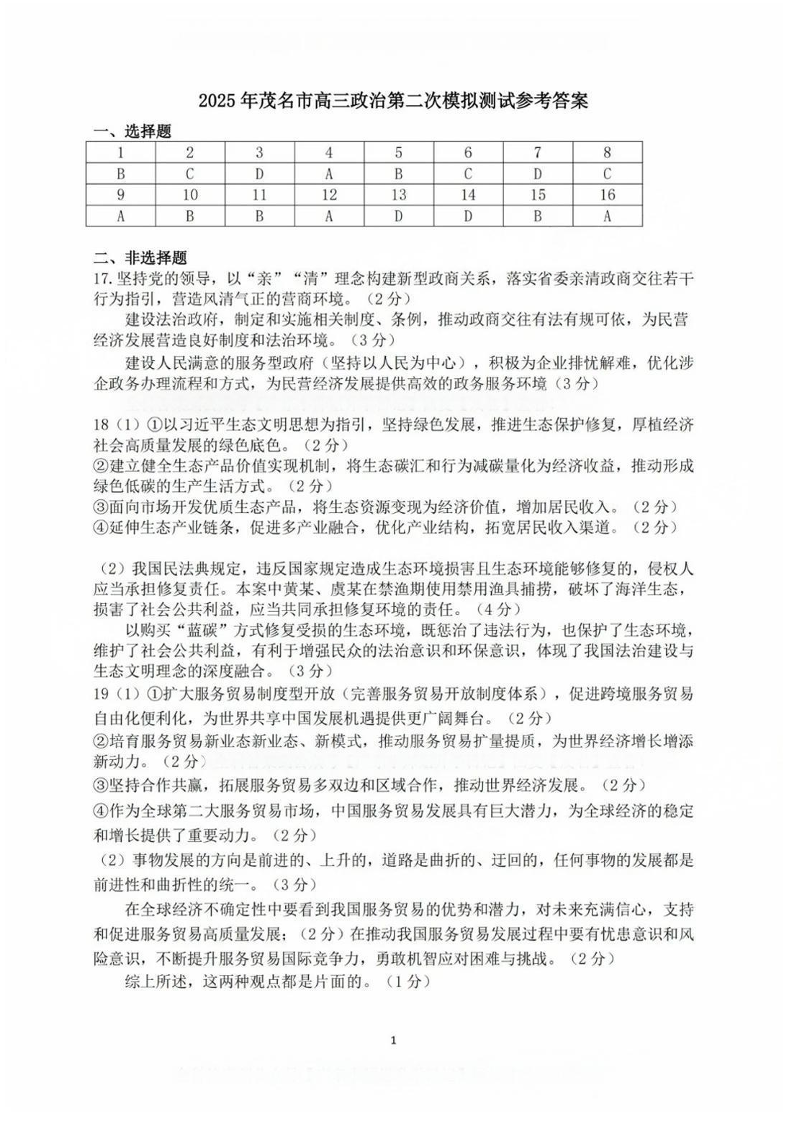 广东省茂名市2025年高三年级第二次综合测试 政治答案.pdf