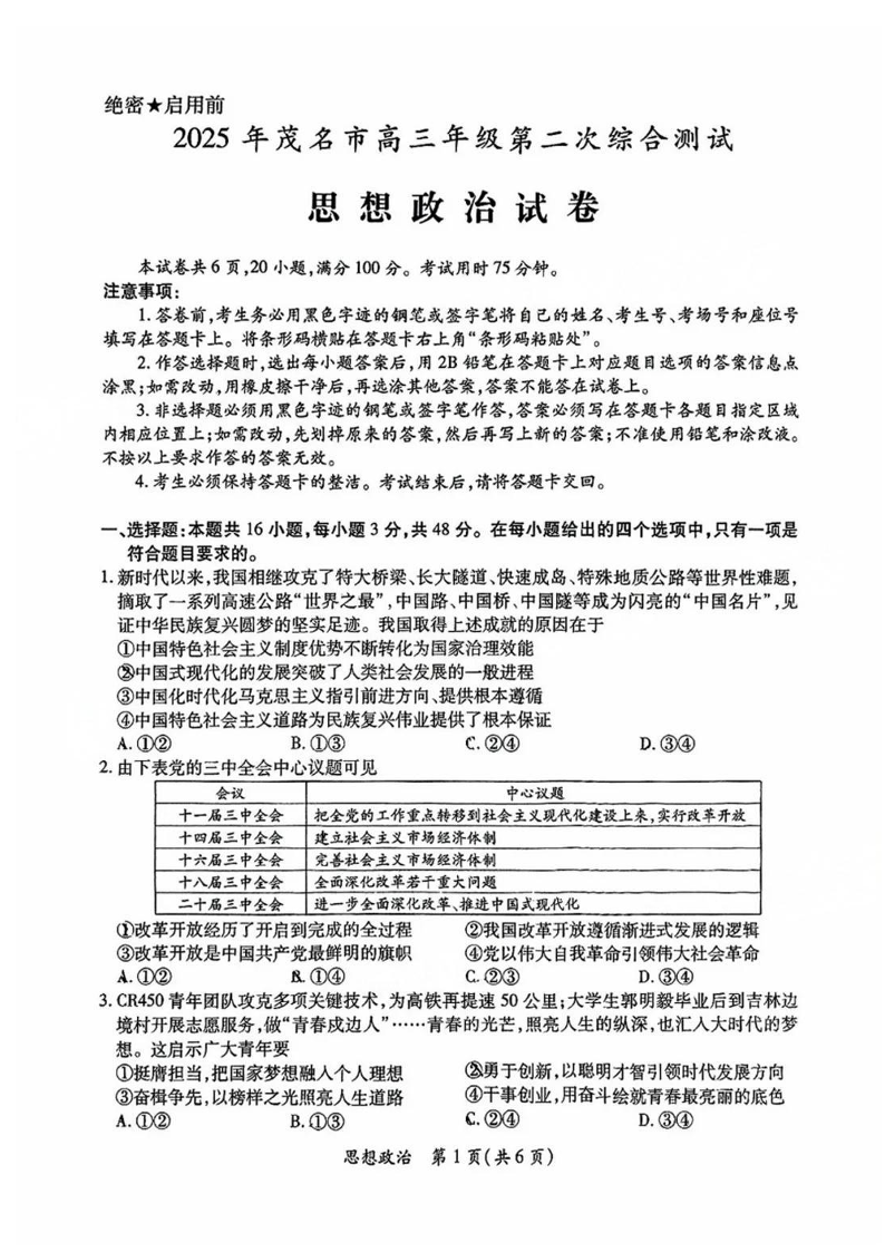 广东省茂名市2025年高三年级第二次综合测试 政治.pdf