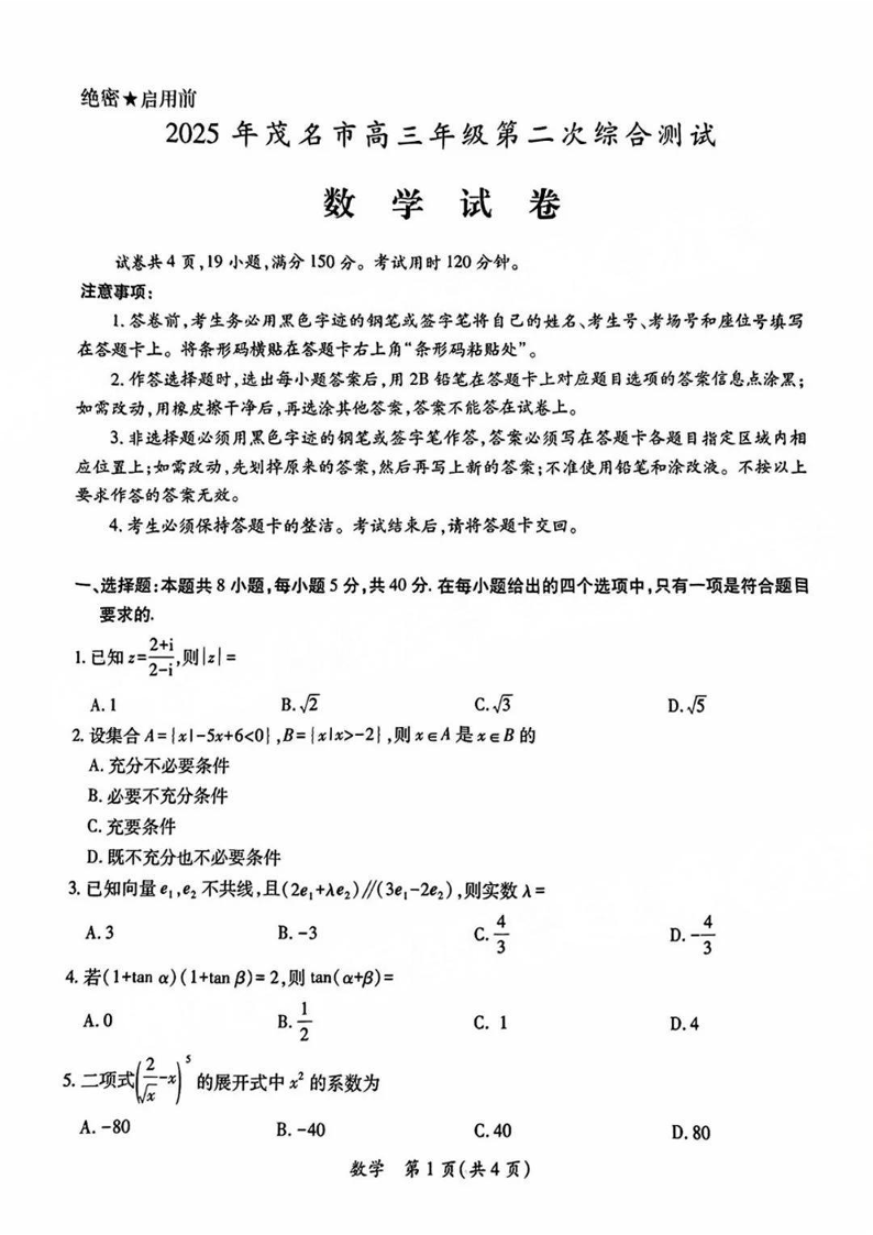 广东省茂名市2025年高三年级第二次综合测试 数学.pdf