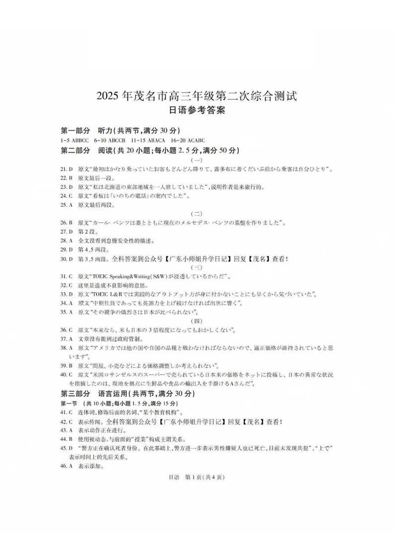 广东省茂名市2025年高三年级第二次综合测试 日语答案.pdf