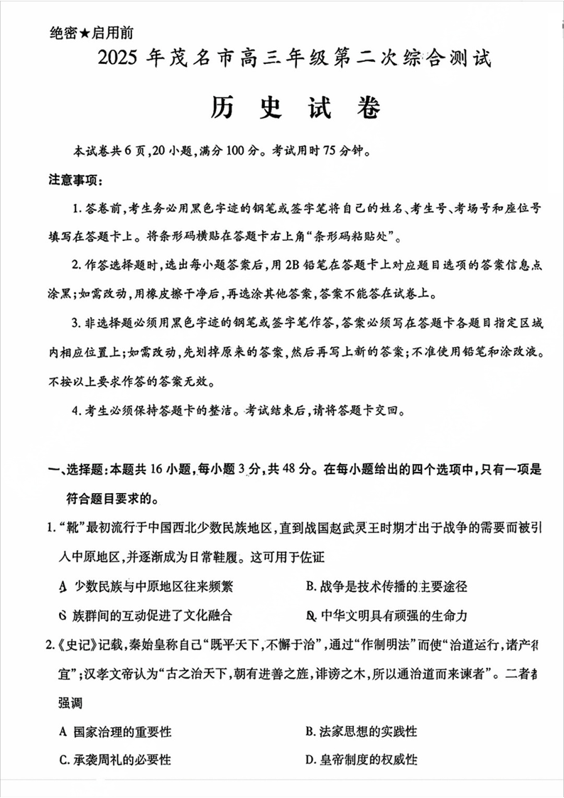 广东省茂名市2025年高三年级第二次综合测试 历史.pdf