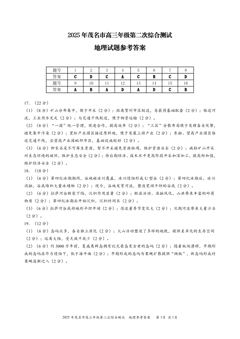 广东省茂名市2025年高三年级第二次综合测试 地理答案.pdf