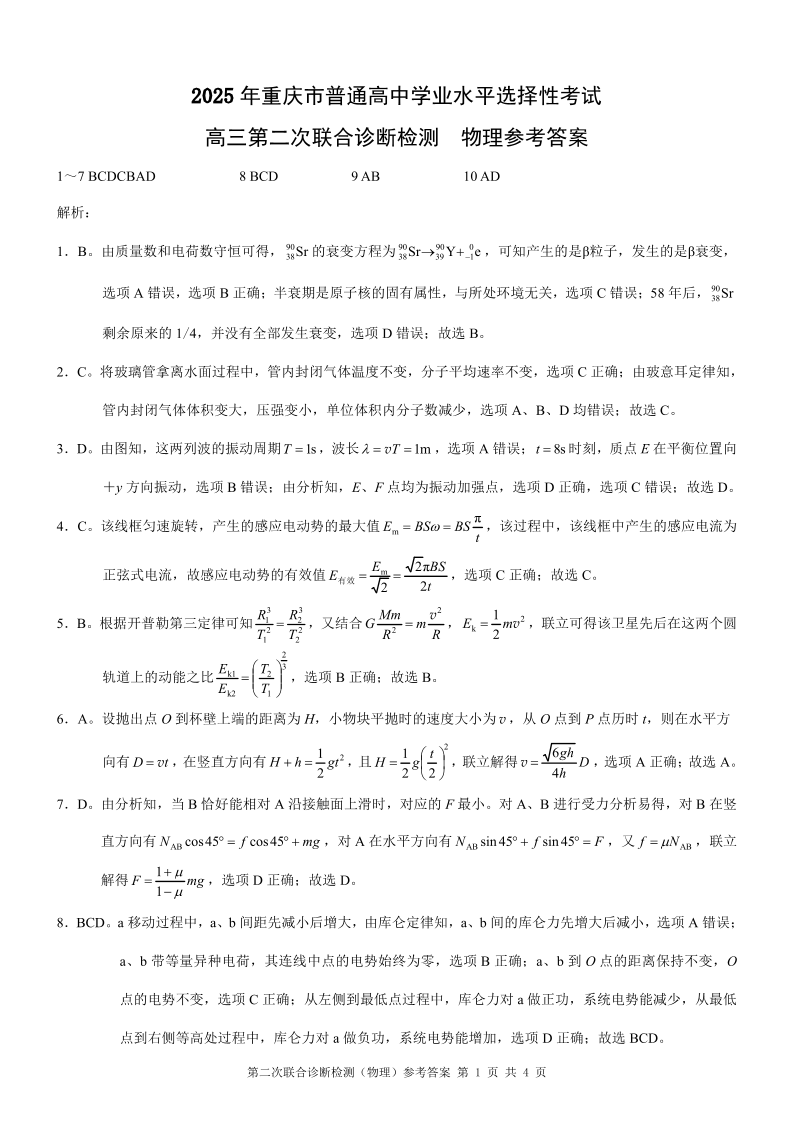 重庆市普通高中2025年高三第二次联合诊断检测(康德卷)物理参考答案.pdf