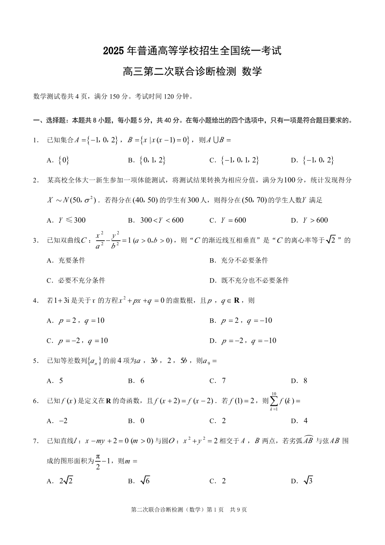重庆市普通高中2025年高三第二次联合诊断检测(康德卷)数学.pdf
