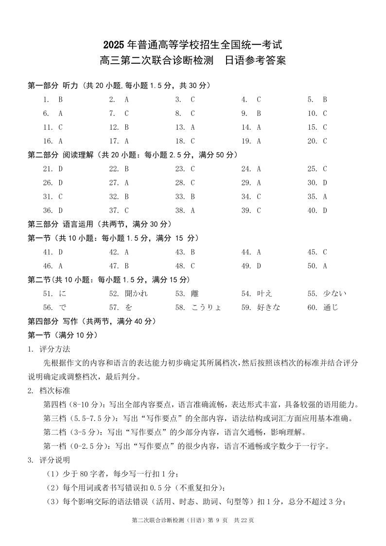 重庆市普通高中2025年高三第二次联合诊断检测(康德卷)日语参考答案.pdf