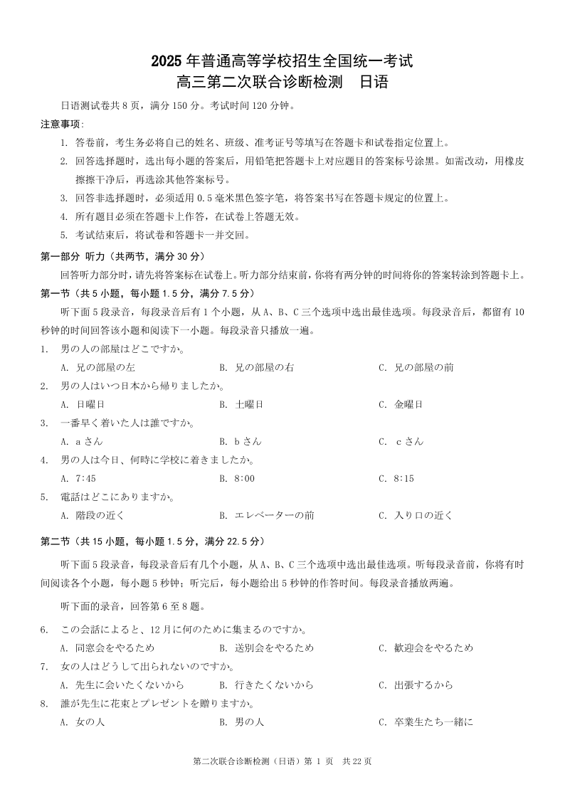 重庆市普通高中2025年高三第二次联合诊断检测(康德卷)日语.pdf
