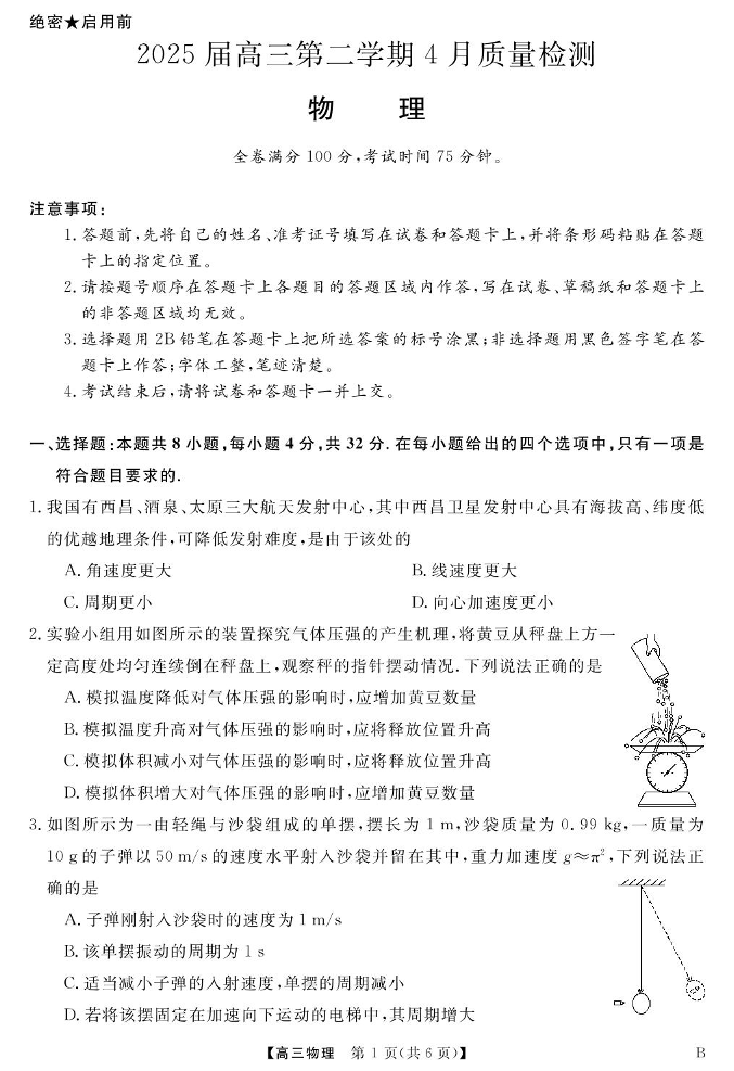 安徽师范大学附属中学2025届下学期4月质量检测 物理(含答案).pdf