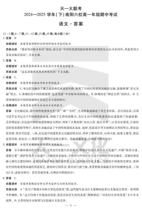 河南省2024-2025学年(下)南阳六校高一年级期中考试 语文答案.pdf