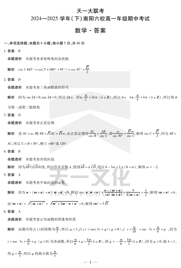 河南省2024-2025学年(下)南阳六校高一年级期中考试 数学答案.pdf