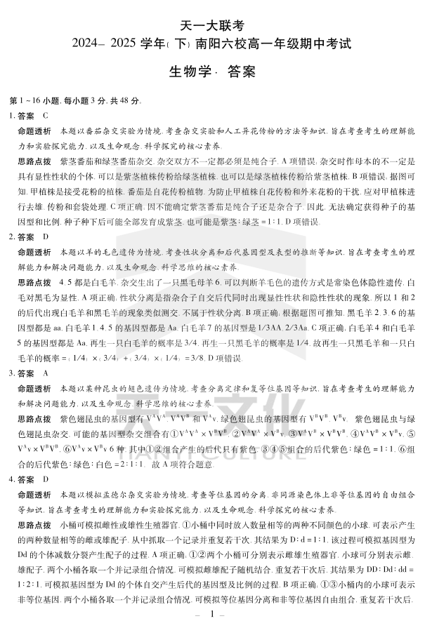 河南省2024-2025学年(下)南阳六校高一年级期中考试 生物答案.pdf