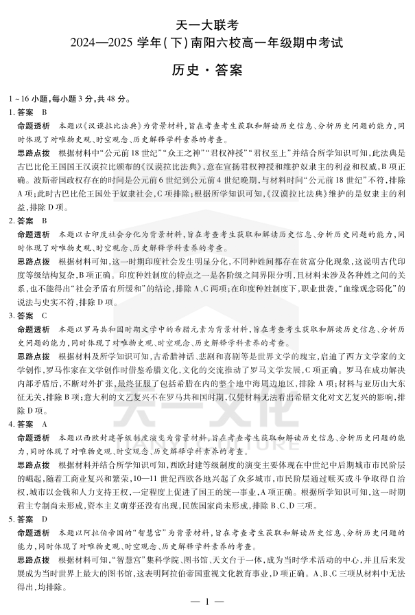河南省2024-2025学年(下)南阳六校高一年级期中考试 历史答案.pdf