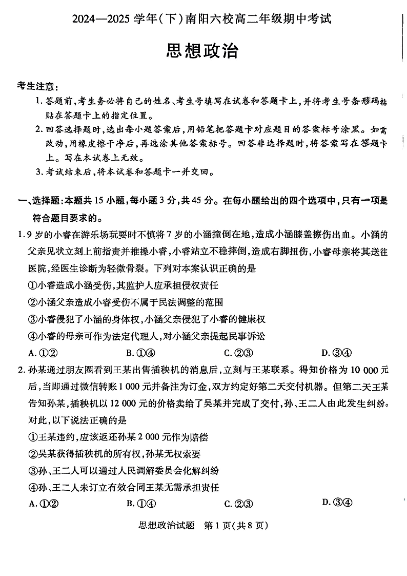 河南省2024-2025学年(下)南阳六校高二年级期中考试 政治.pdf