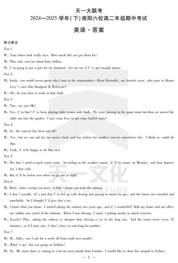 河南省2024-2025学年(下)南阳六校高二年级期中考试 英语答案.pdf