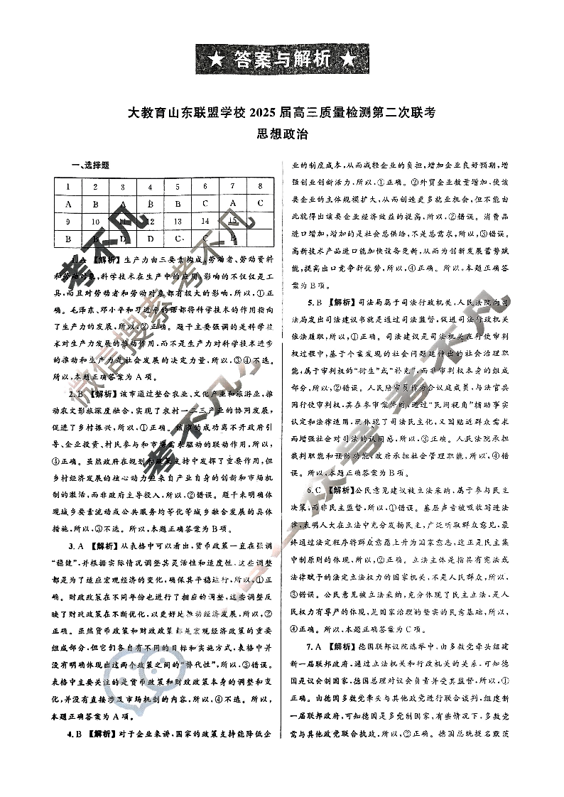 大教育山东联盟2025届高三质量检测第二次联考 政治答案.pdf