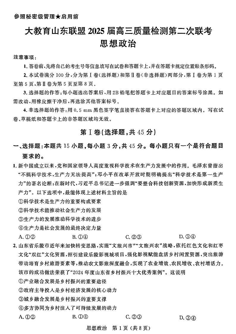 大教育山东联盟2025届高三质量检测第二次联考 政治.pdf