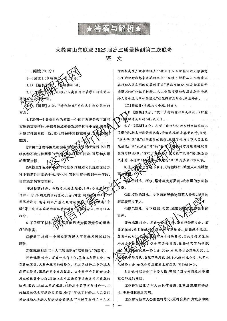 大教育山东联盟2025届高三质量检测第二次联考 语文答案.pdf
