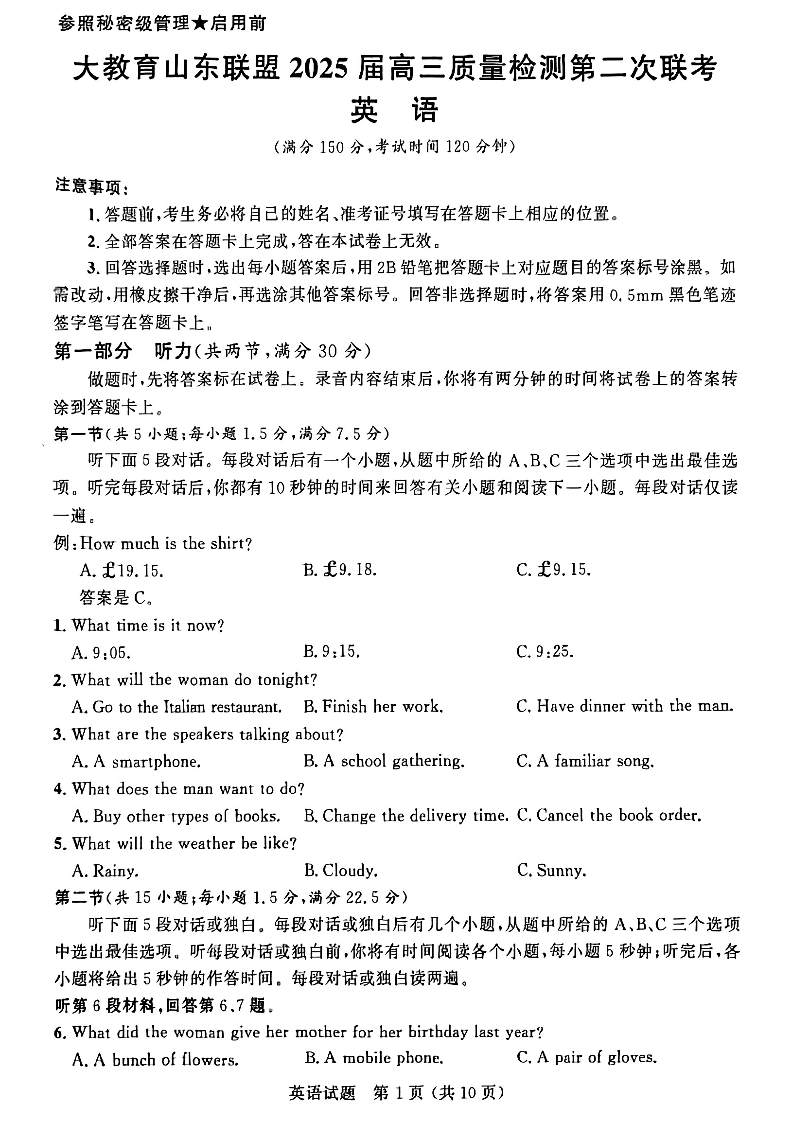 大教育山东联盟2025届高三质量检测第二次联考 英语.pdf