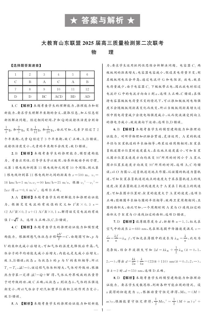 大教育山东联盟2025届高三质量检测第二次联考 物理答案.pdf