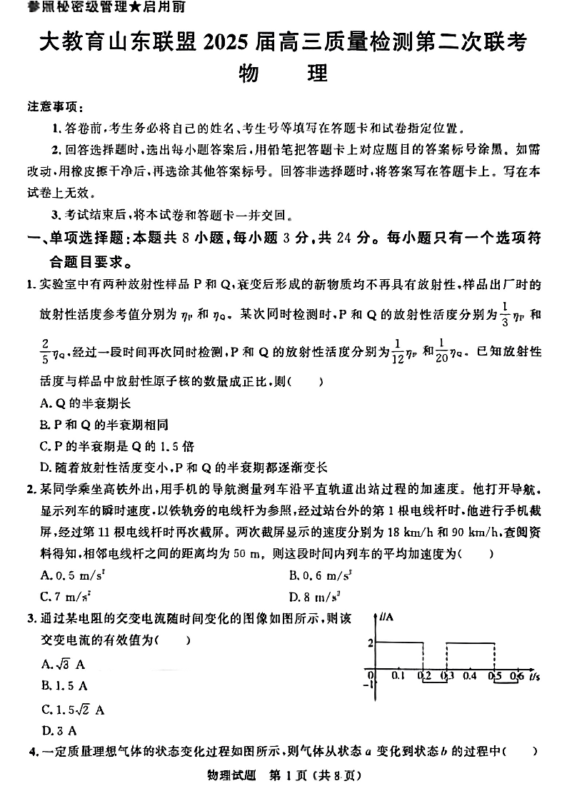 大教育山东联盟2025届高三质量检测第二次联考 物理.pdf