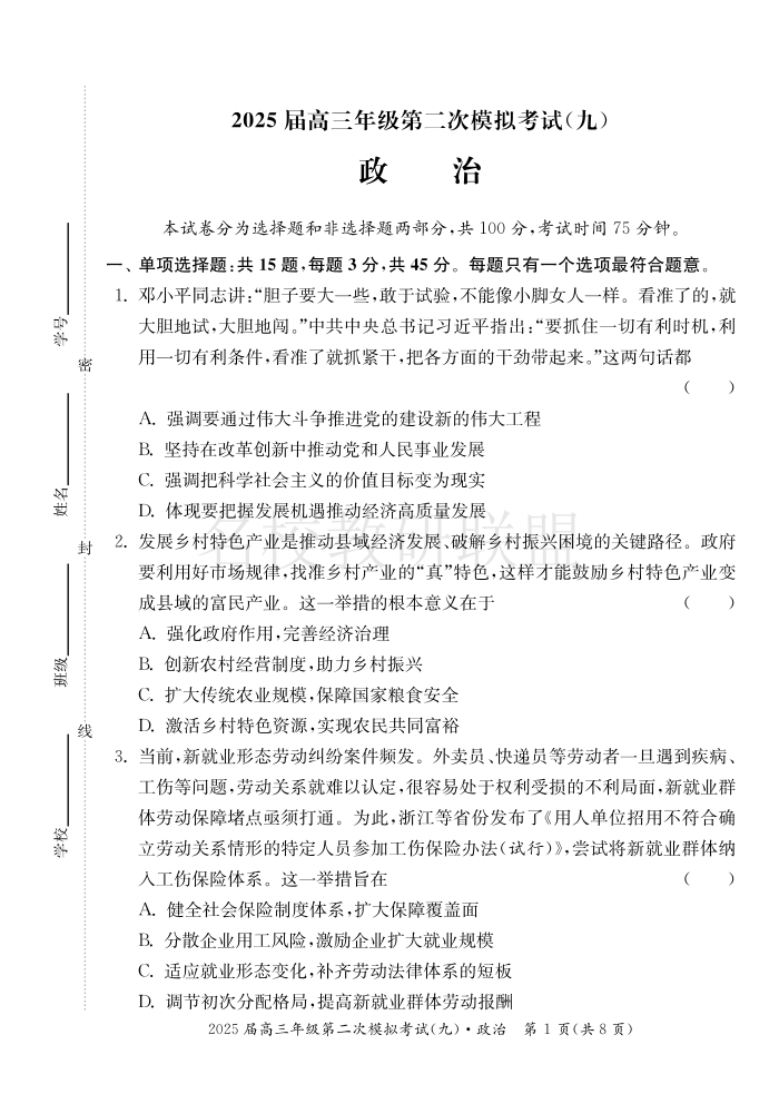 江苏省南通市如皋市2025届高三下学期适应性考试(二) 政治(含答案).pdf