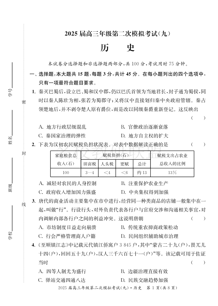 江苏省南通市如皋市2025届高三下学期适应性考试(二) 历史(含答案).pdf