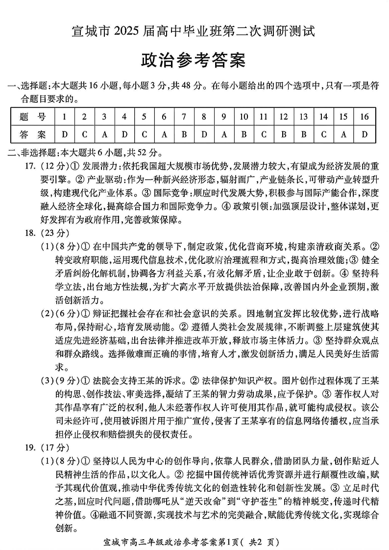 安徽省宣城市/黄山市2025届高中毕业班第二次调研测试 政治答案.pdf