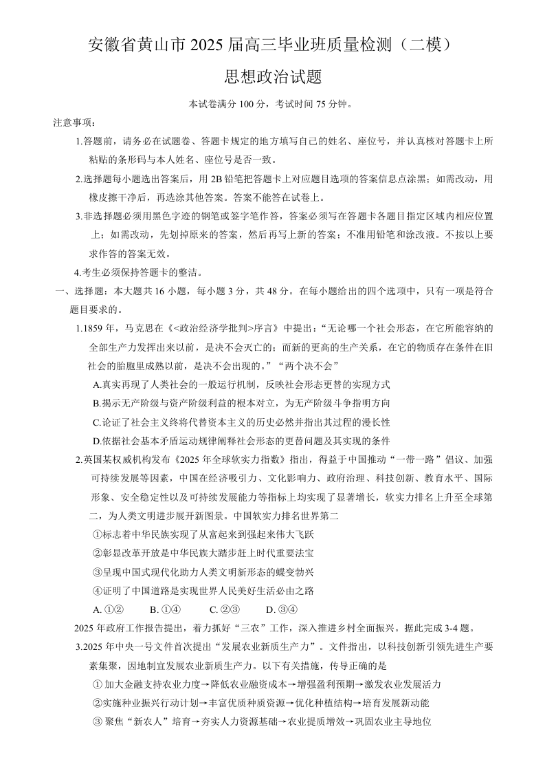安徽省宣城市/黄山市2025届高中毕业班第二次调研测试 政治.docx