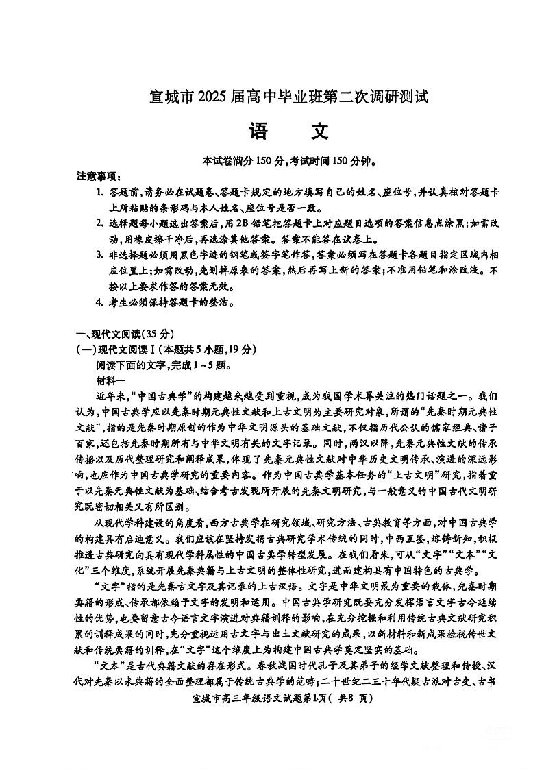 安徽省宣城市/黄山市2025届高中毕业班第二次调研测试 语文.pdf