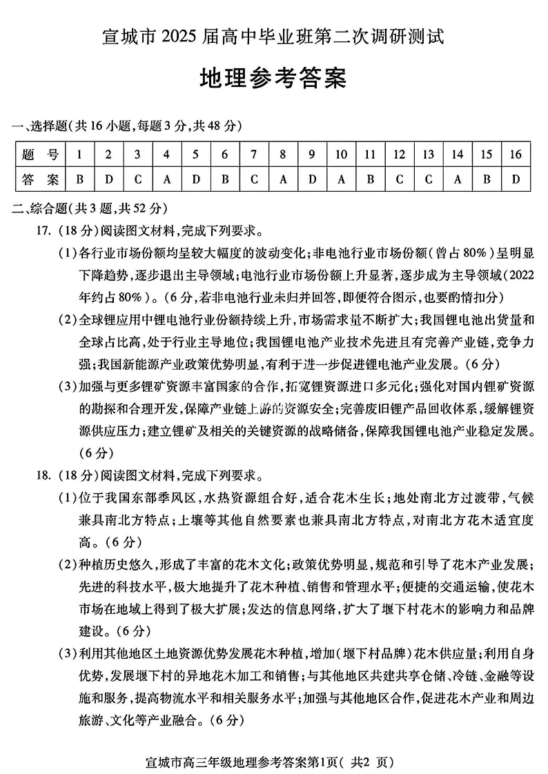安徽省宣城市/黄山市2025届高中毕业班第二次调研测试 地理答案.pdf