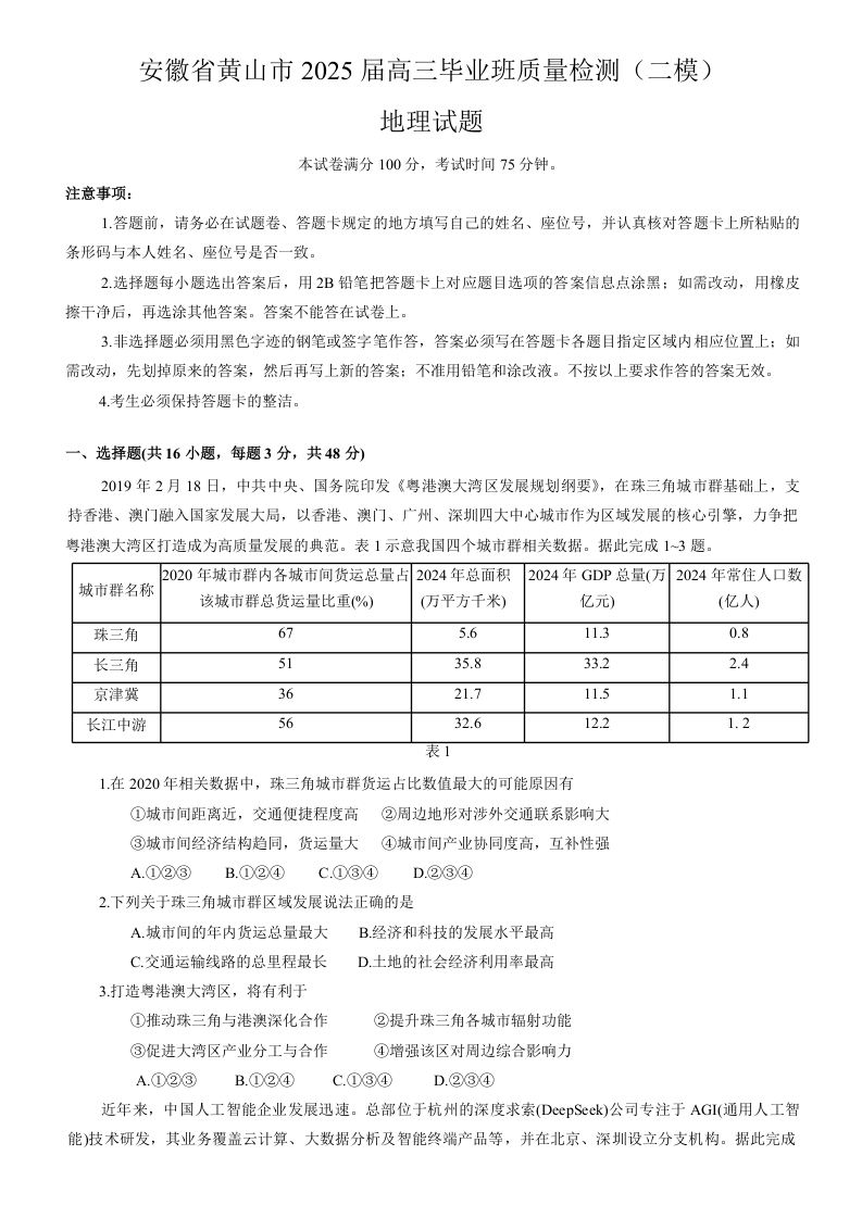 安徽省宣城市/黄山市2025届高中毕业班第二次调研测试 地理.docx