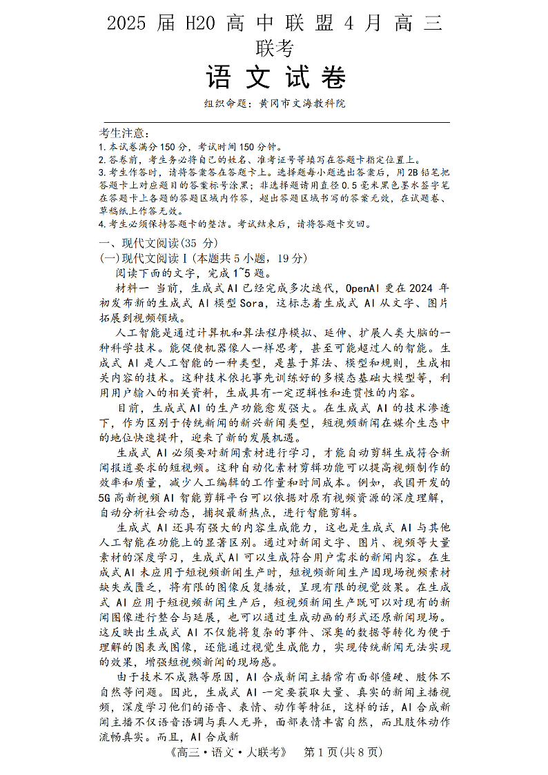 河南省2025届H20高中联盟4月高三联考 语文.pdf