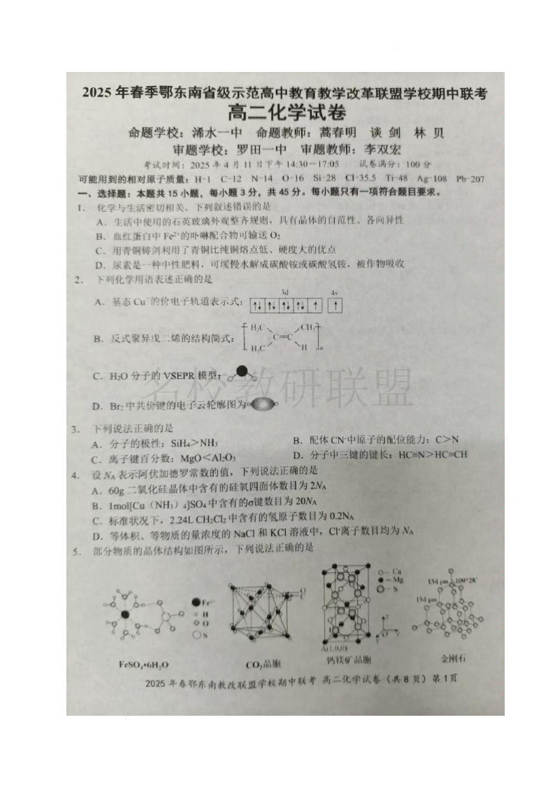 2025年春季湖北省鄂东南省级示范高中高二下学期4月期中联考 化学.pdf