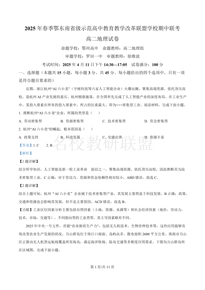 2025年春季湖北省鄂东南省级示范高中高二下学期4月期中联考 地理答案.pdf