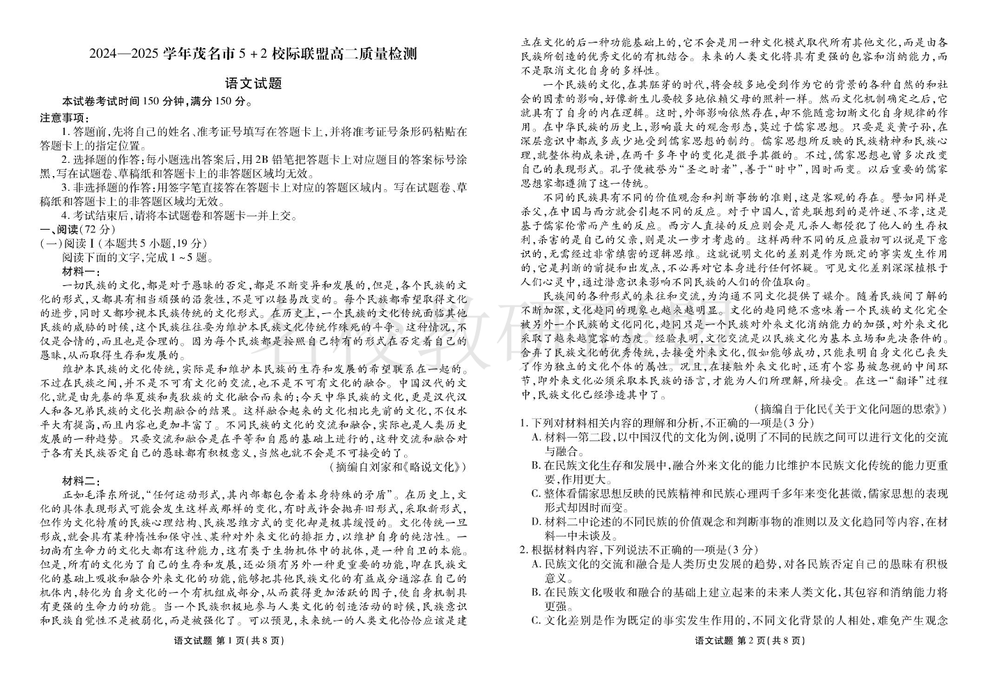 广东省茂名市5+2校际联盟2024-2025学年高二质量检测 语文(含答案).pdf