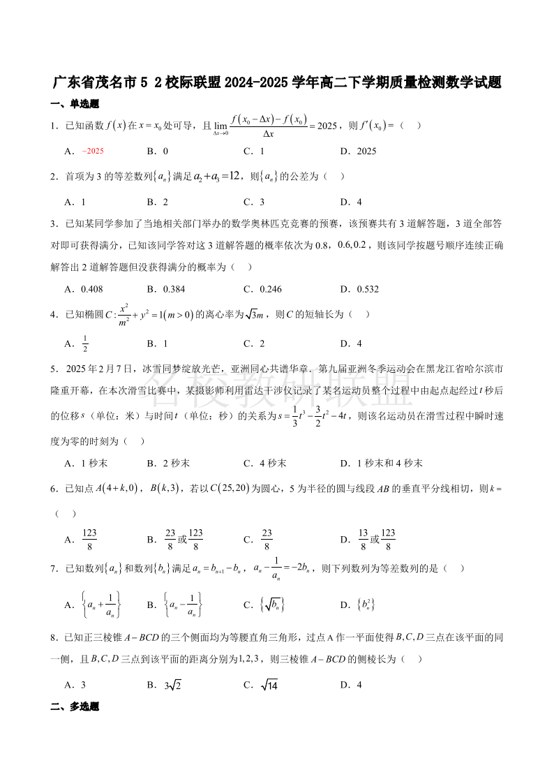 广东省茂名市5+2校际联盟2024-2025学年高二质量检测 数学(含答案).pdf