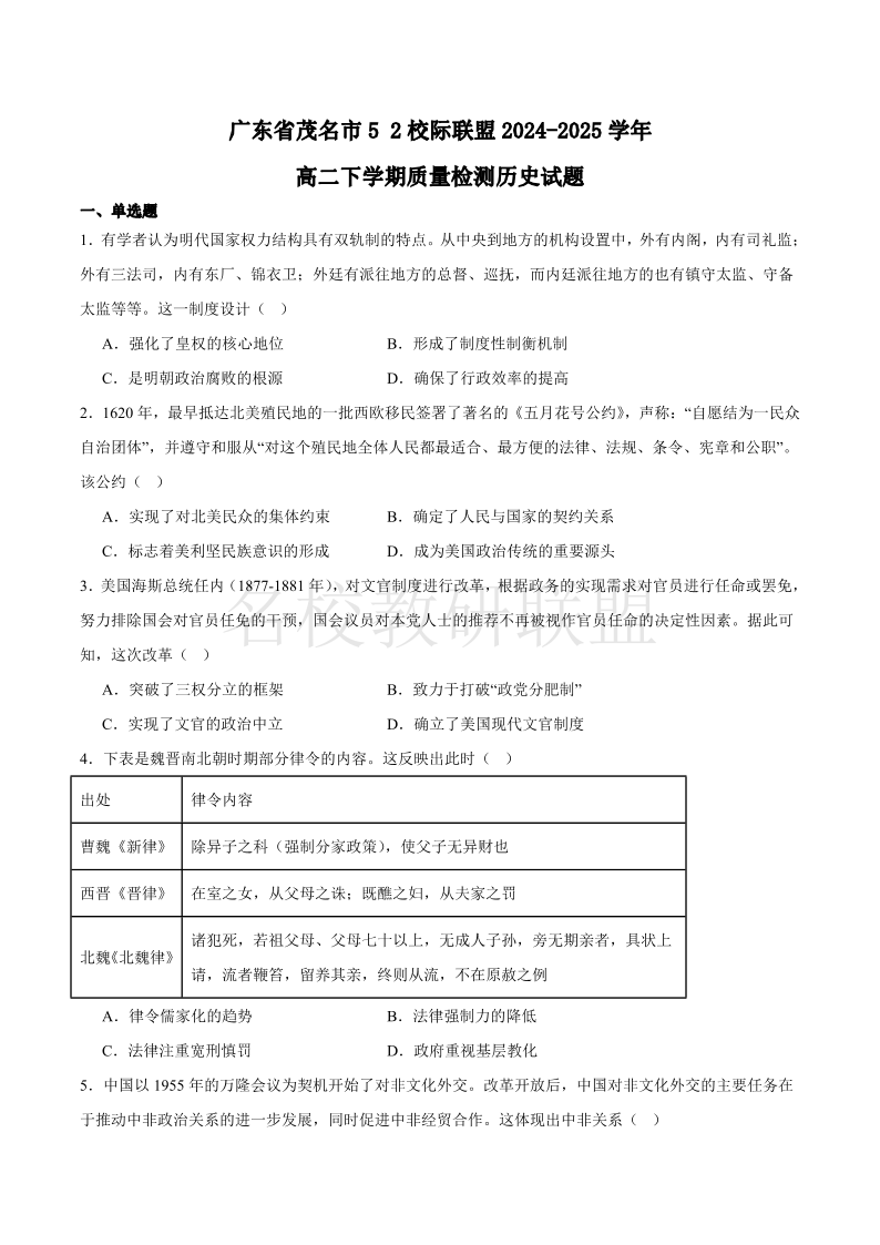 广东省茂名市5+2校际联盟2024-2025学年高二质量检测 历史(含答案).pdf