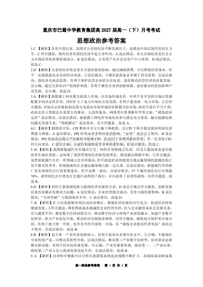 重庆市巴蜀中学高2027届高一(下)3月月考 政治答案.pdf